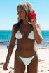 Las telas lisas de colores combinados pueden desteñir levemente entre sí y perder intensidad con el uso, la exposición al sol y los químicos de las piletas. Evitar el contacto de la bikini húmeda con otras prendas y el roce de la misma con superficies ásperas para no dañar la lycra.